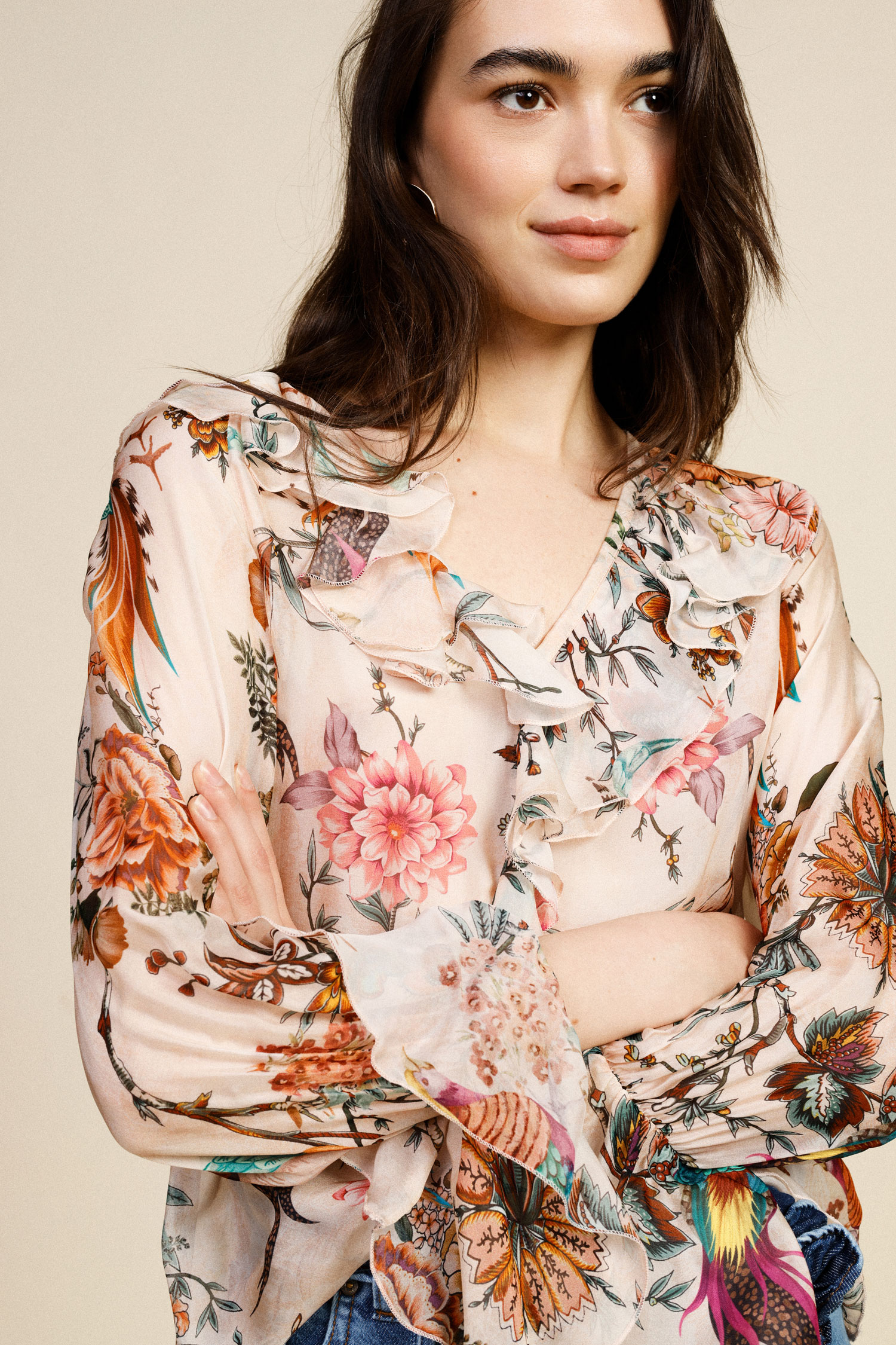 Táto precízne spracovaná blúzka zaujme jemnou kvetinovou potlačou, ktorá evokuje sviežosť a slobodu. Volány dodávajú modelu pohyb a ladnosť, vďaka čomu je ideálnou voľbou pre tých, ktorí hľadajú nenútenú eleganciu na každý deň. Splývavý strih poskytuje pohodlie bez kompromisov v štýle, vhodný na akúkoľvek príležitosť.