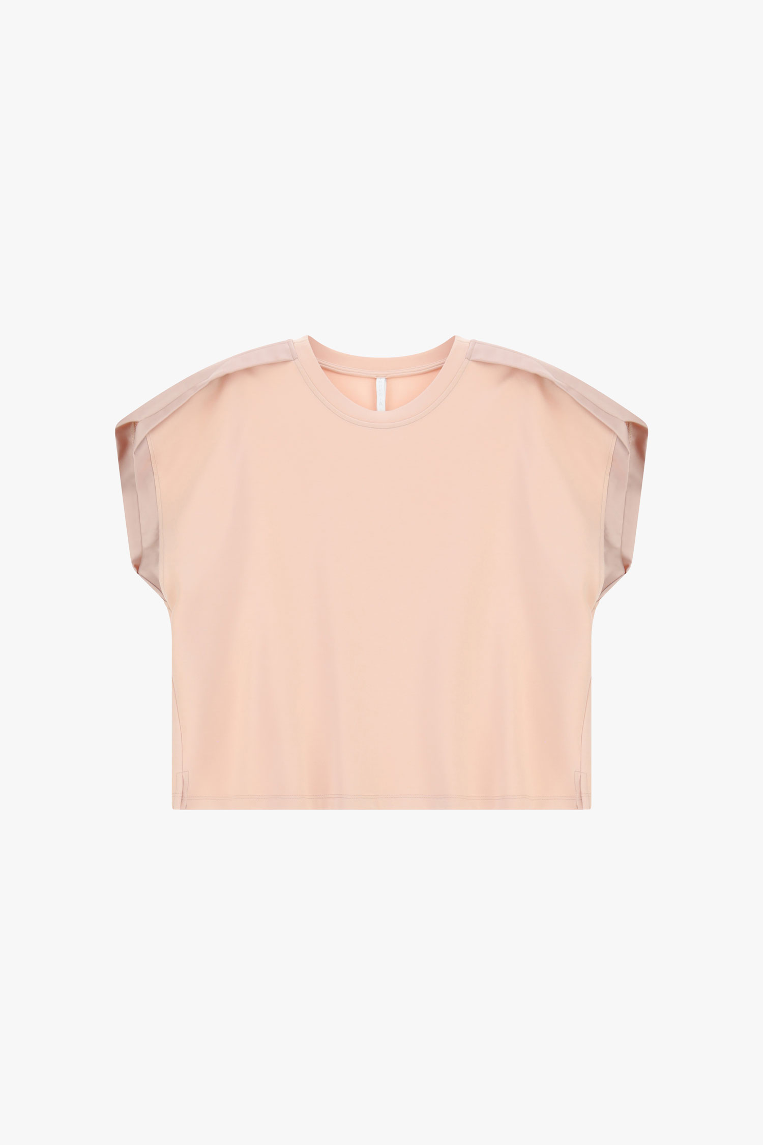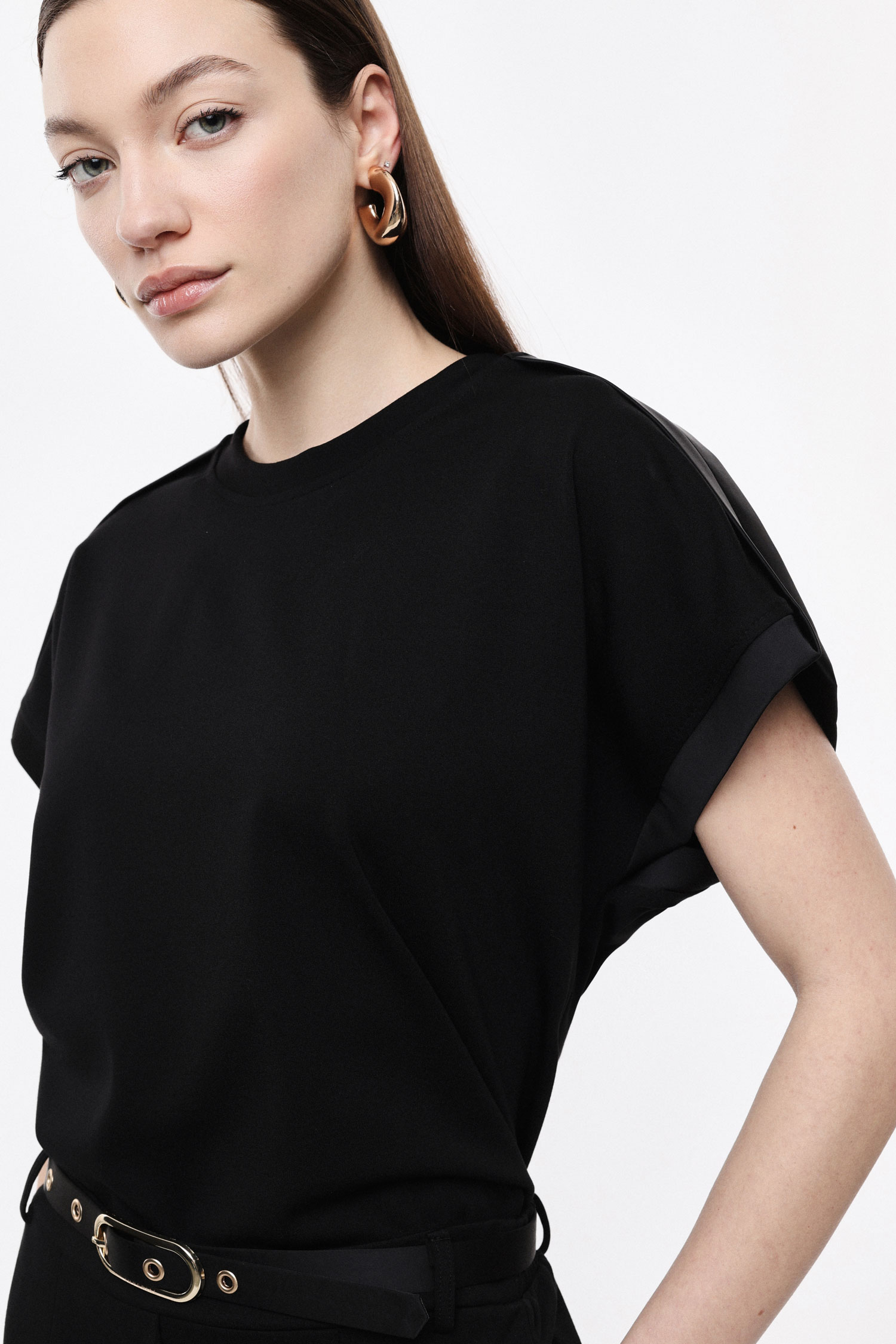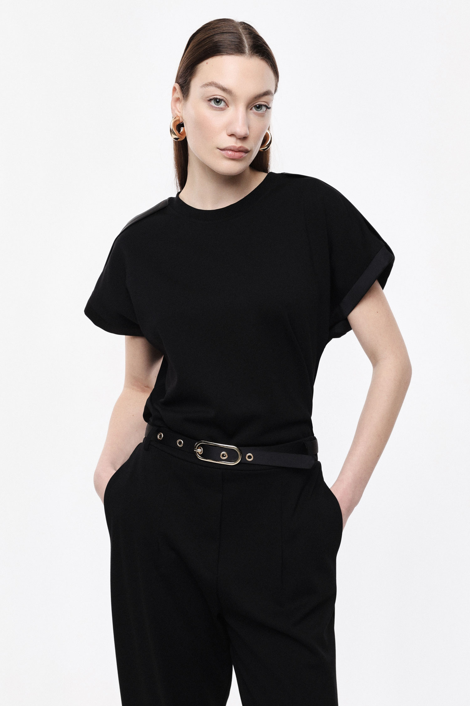 Boxy top so štruktúrovanými ramenami a výrazným lemovaným detailom pozdĺž ramien. Všestranná voľba vhodná do ležérnych outfitov aj do sofistikovanejších kombinácií. Dostupný v rôznych odtieňoch, aby vyhovoval rozličným osobným štýlom a kreatívnym prejavom.