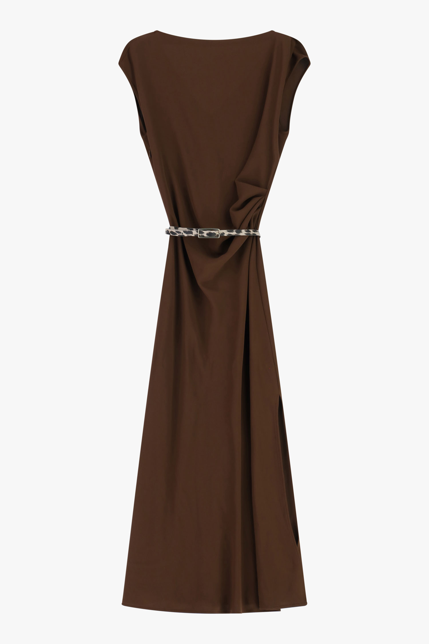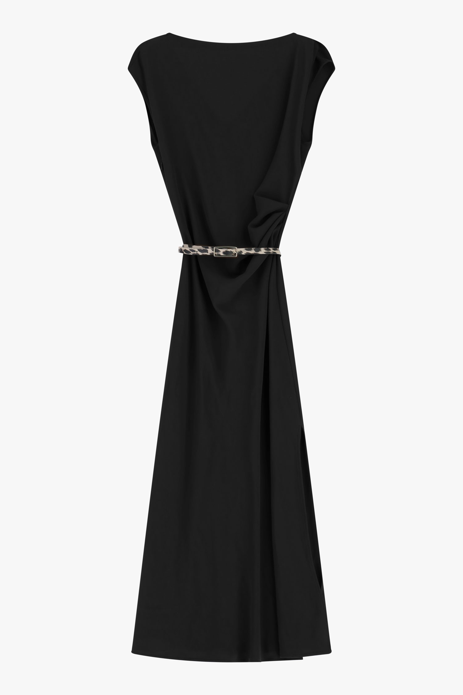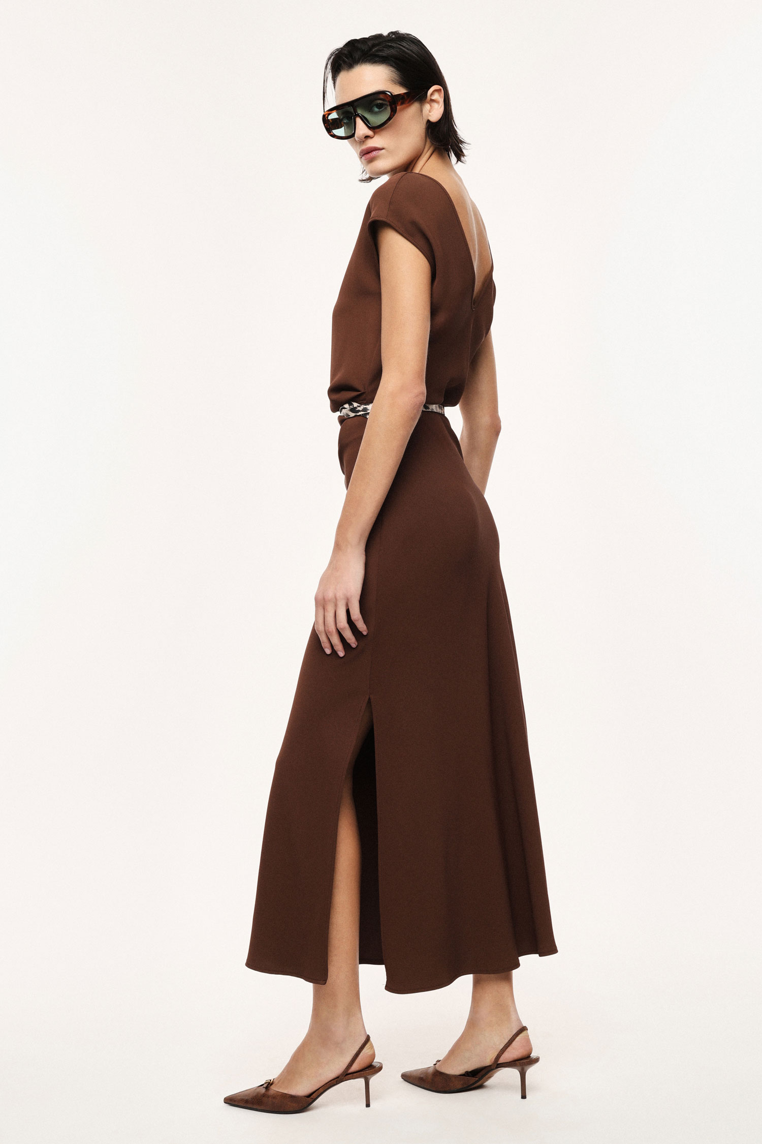 Dlhé šaty so splývavou siluetou a lodičkovým výstrihom sú doplnené úzkym opaskom so zvieracím vzorom, ktorý zvýrazňuje pás. Krátke rukávy a bočné rozparky zabezpečujú pohodlie a voľnosť pohybu, čím umožňujú vytvárať výrazné, moderné outfity s mestským charakterom.