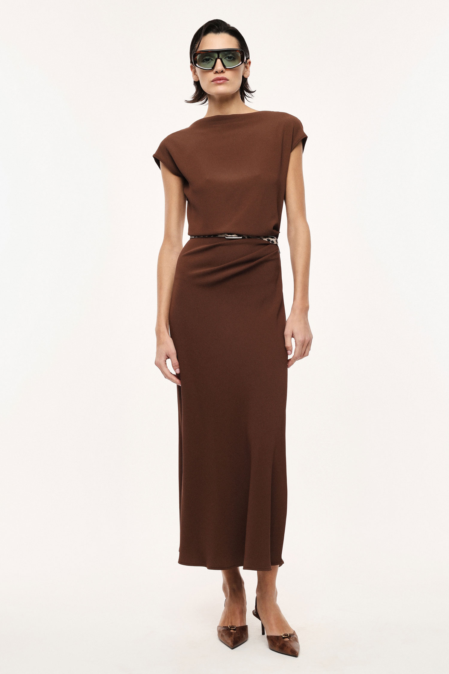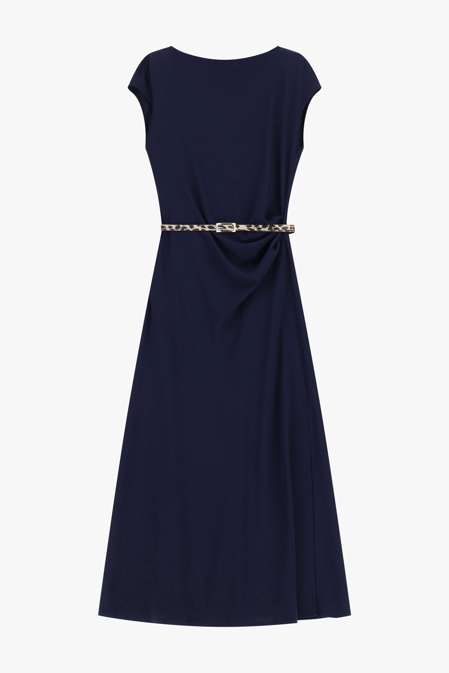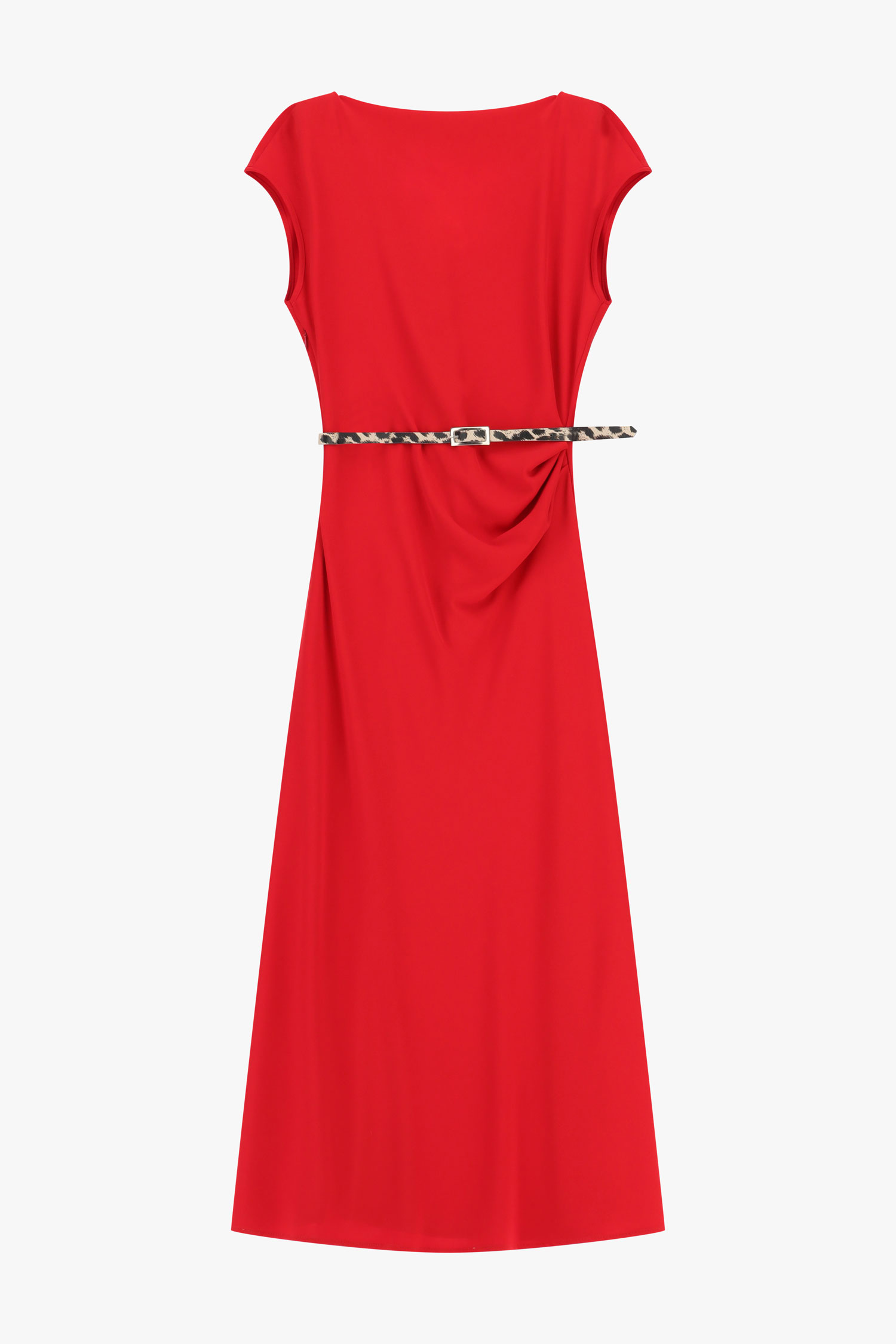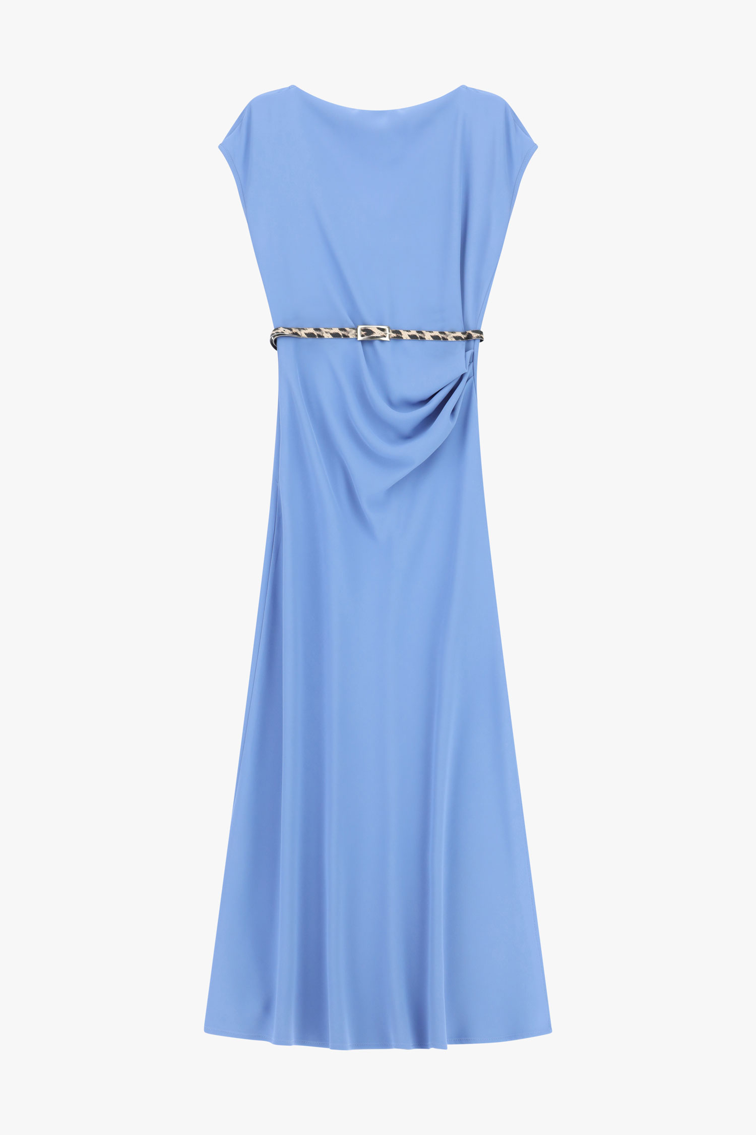 Dlhé šaty so splývavou siluetou a lodičkovým výstrihom sú doplnené úzkym opaskom so zvieracím vzorom, ktorý zvýrazňuje pás. Krátke rukávy a bočné rozparky zabezpečujú pohodlie a voľnosť pohybu, čím umožňujú vytvárať výrazné, moderné outfity s mestským charakterom.