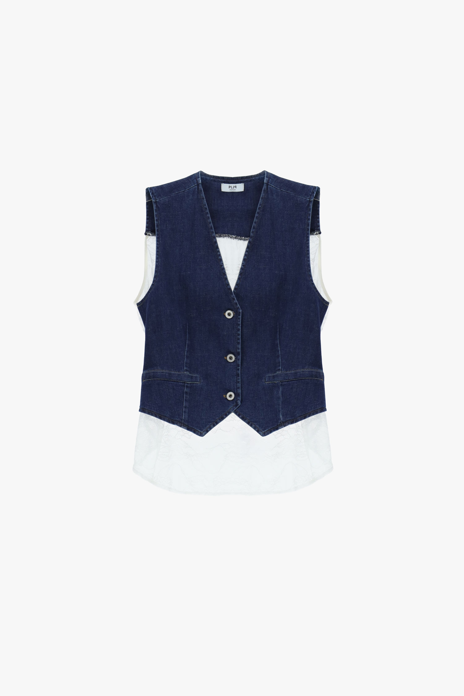 Džínsová vesta s rovným strihom a zapínaním na tri gombíky prináša ležérny look s jemne krajčírskymi detailmi. Kontrastný lem dodáva výrazný akcent, vďaka čomu je ideálna na vrstvenie a oživenie každodenných outfitov kreatívnym prvkom.