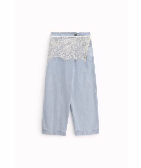Tieto džínsy vynikajú širokým strihom nohavíc, ktorý prináša uvoľnený a moderný look. Vysoký pás pekne zvýrazňuje siluetu, zatiaľ čo splývavý strih zabezpečuje pohodlie pri nosení počas celého dňa. Zaujímavým detailom je jemná čipkovaná aplikácia, ktorá dodáva klasickému denimovému kúsku originálny a ženský nádych.