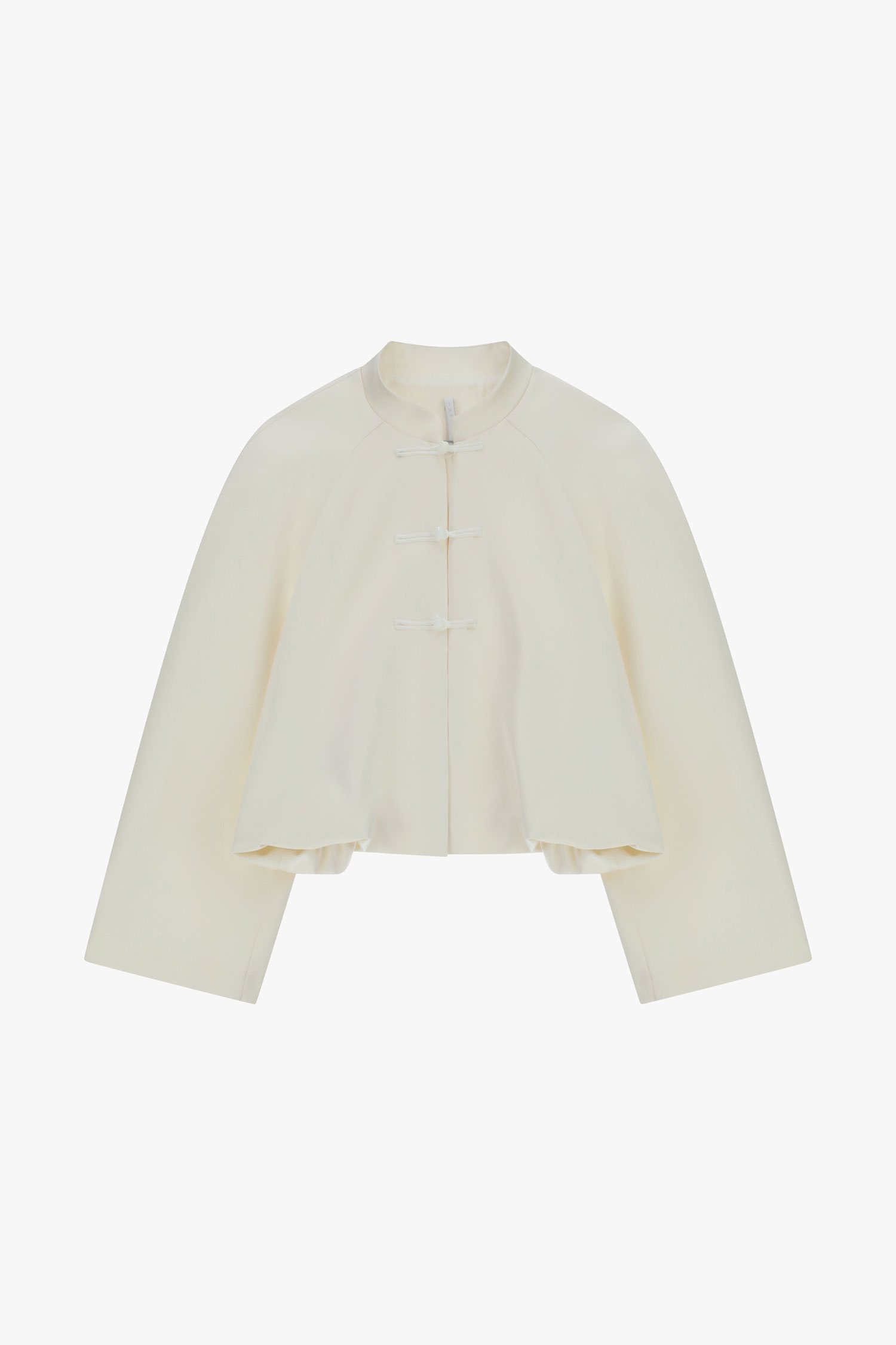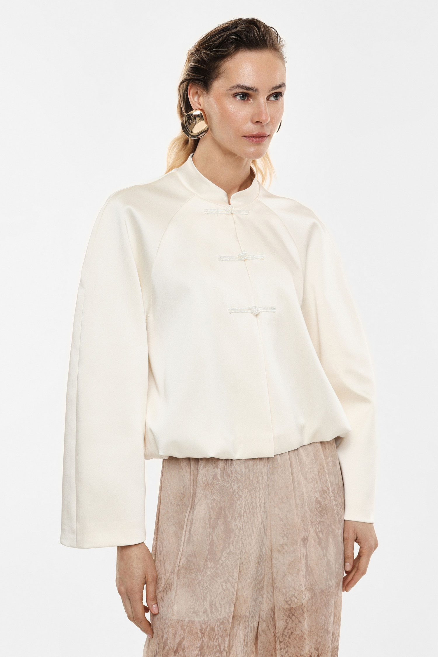 Krátka košeľová bunda so širokými rukávmi a výrazným viazaním na uzlíky vpredu. Čistá, štruktúrovaná silueta zvyšuje všestrannosť a ponúka elegantné možnosti vrstvenia, pričom umožňuje vytvárať originálne outfity vyjadrujúce individuálny štýl v modernom šatníku.