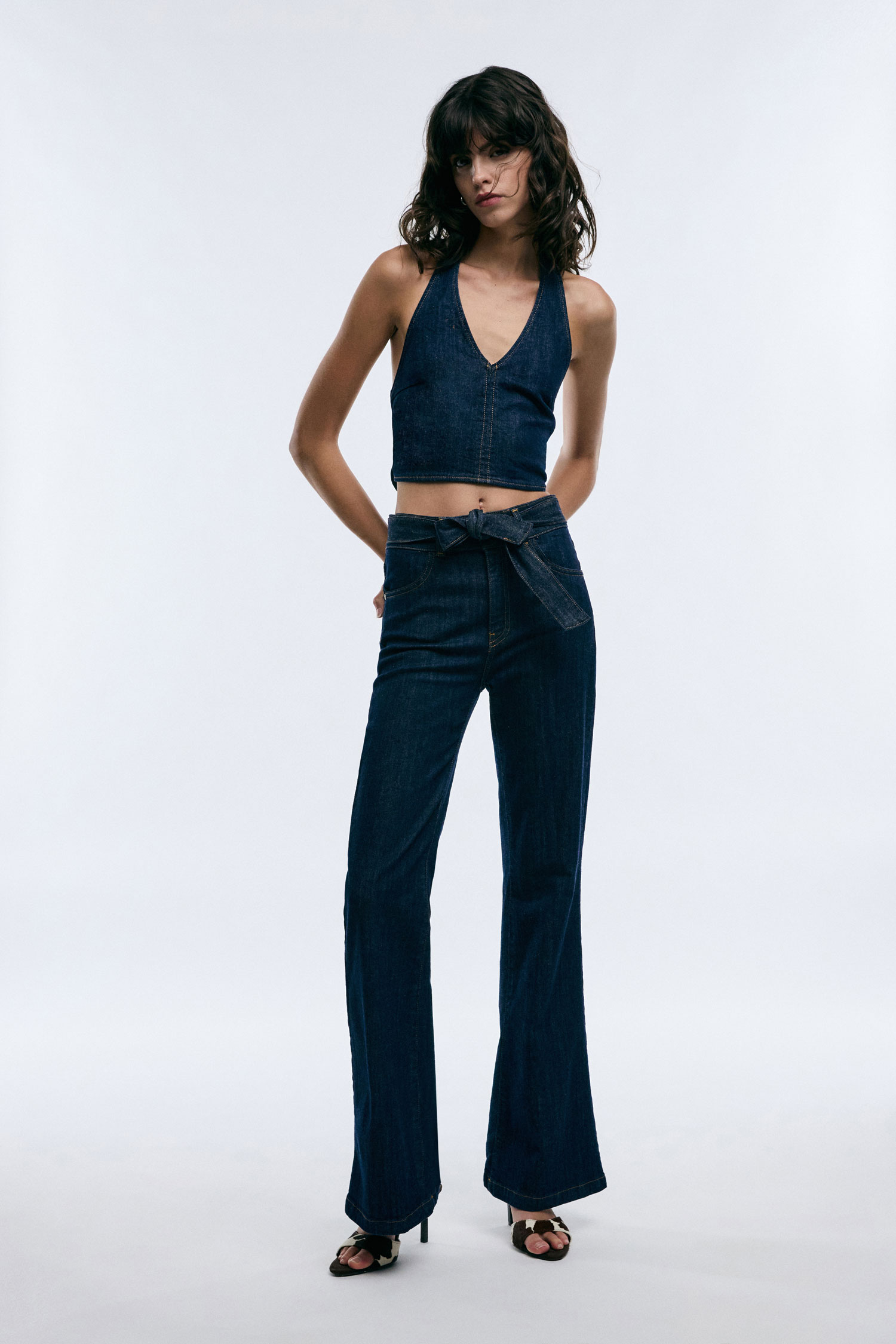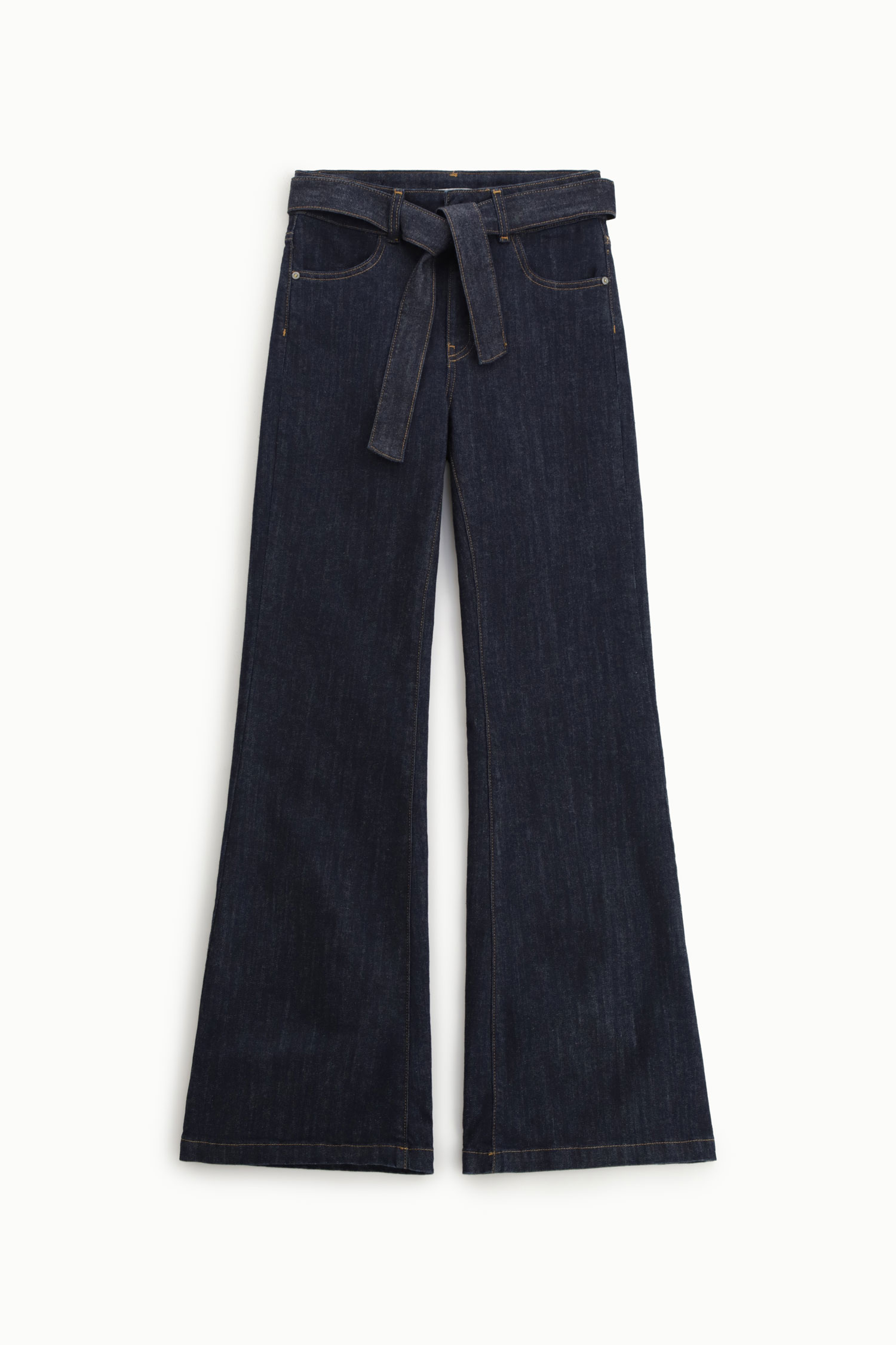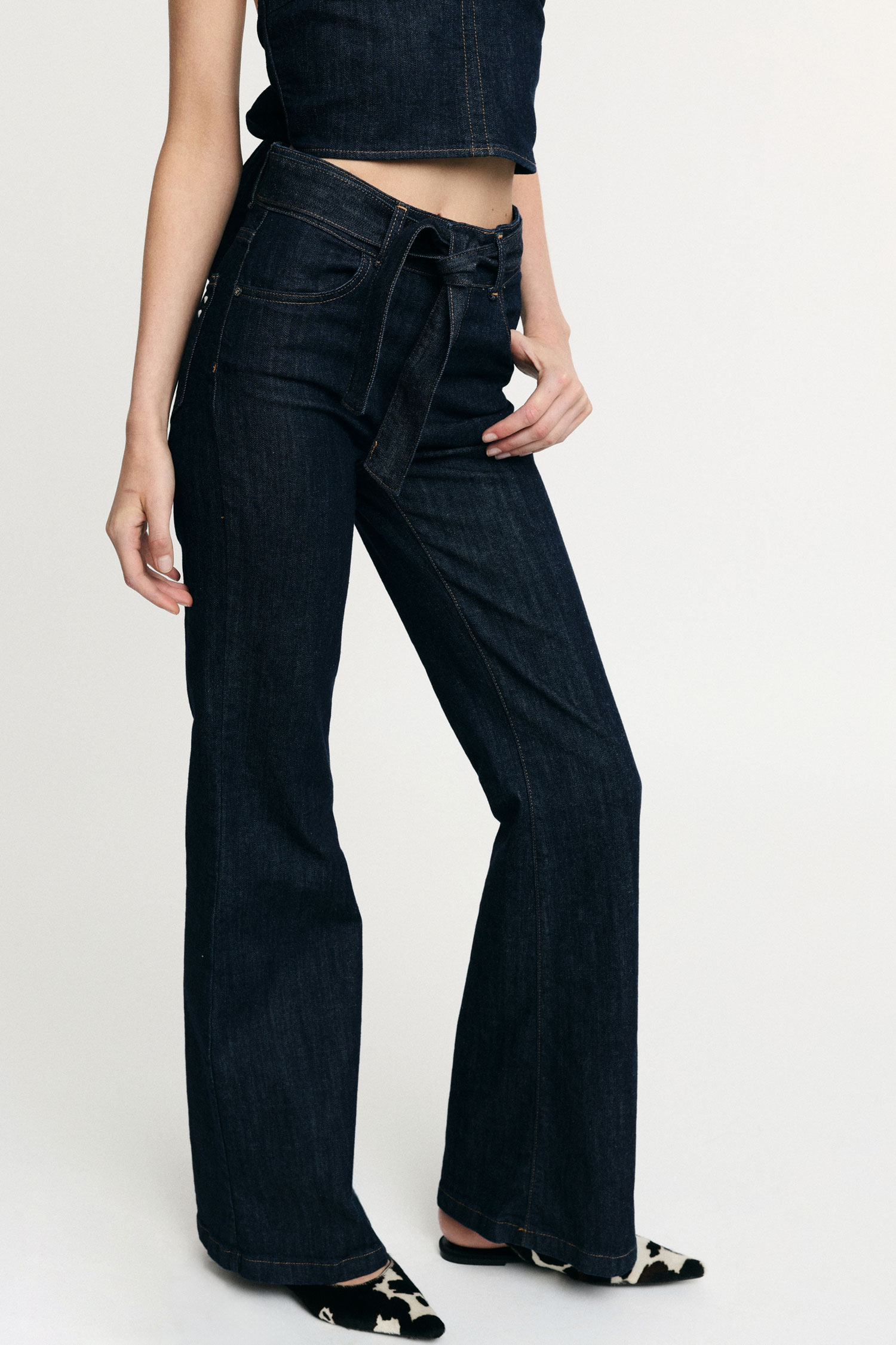 Rozšírené džínsy so širokými nohavicami, vysokým pásom a ladiacim opaskom na viazanie. Predné vrecká a kontrastné prešívanie dotvárajú vzhľad. Strih umožňuje voľnosť pohybu a hravý mestský štýl.