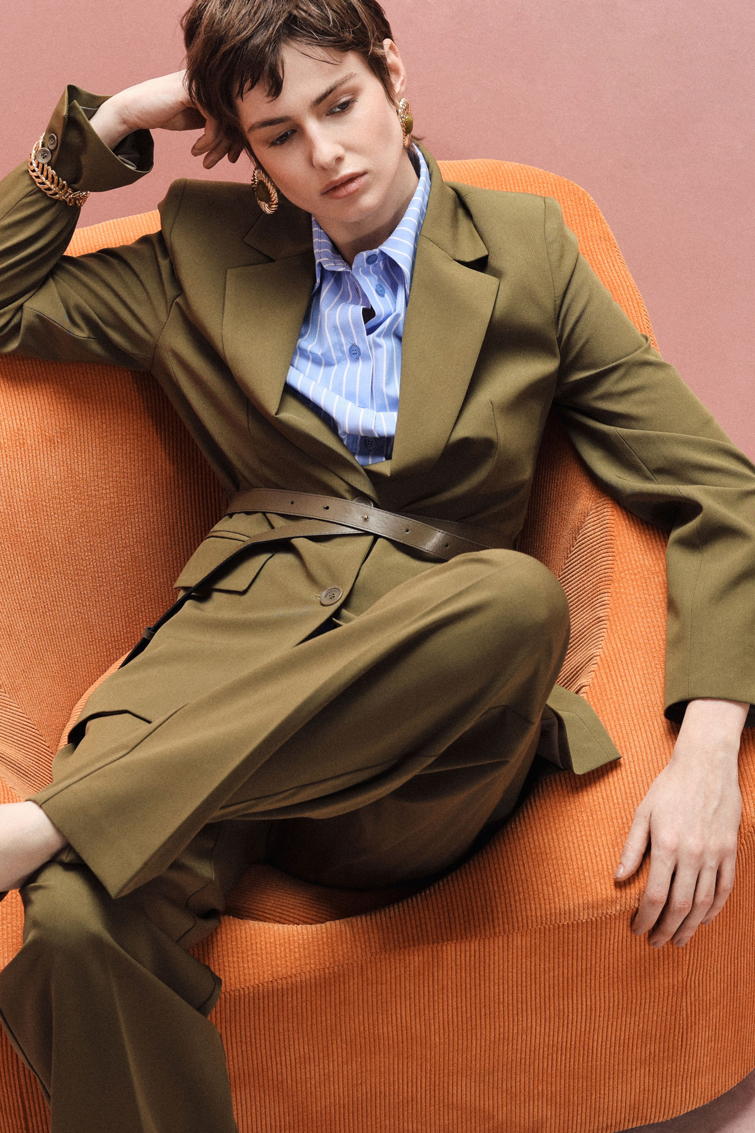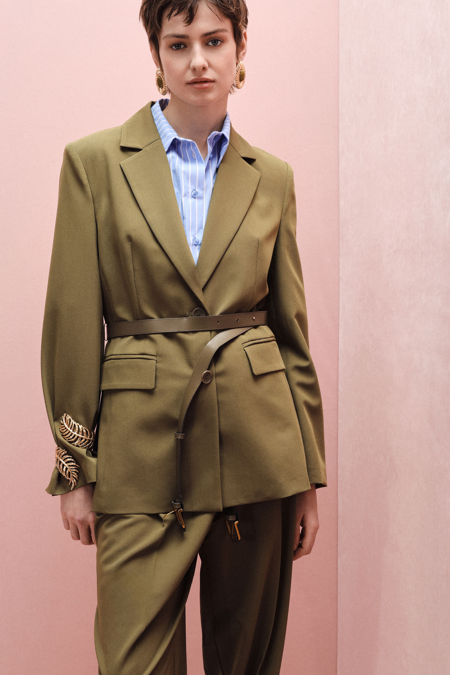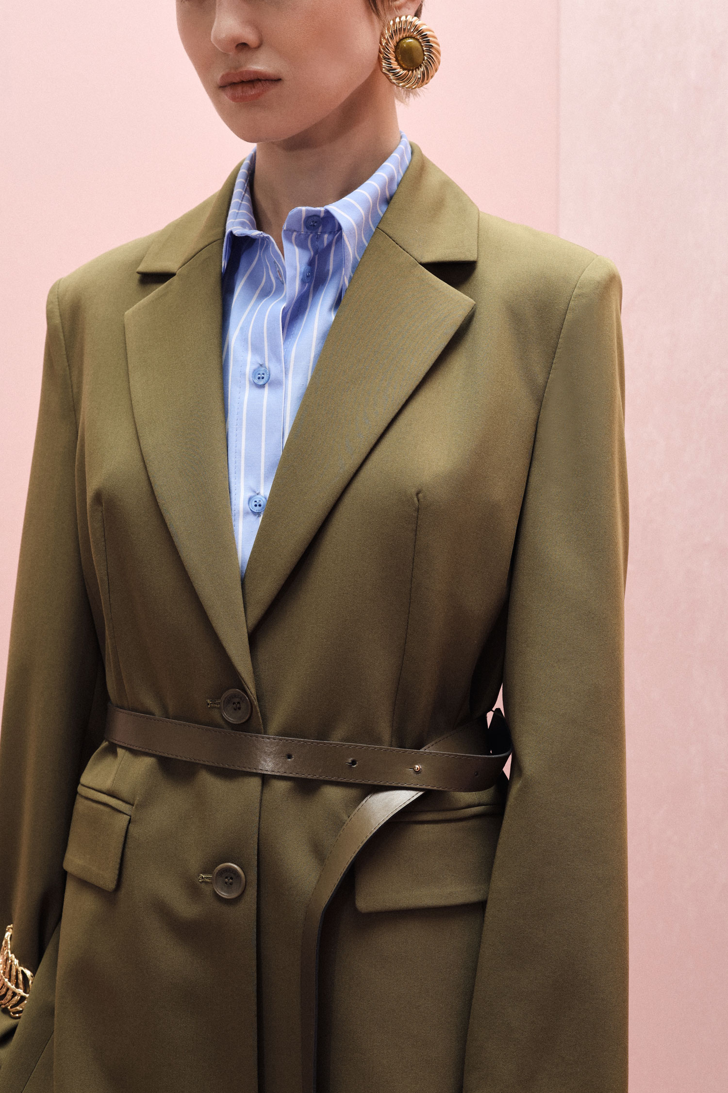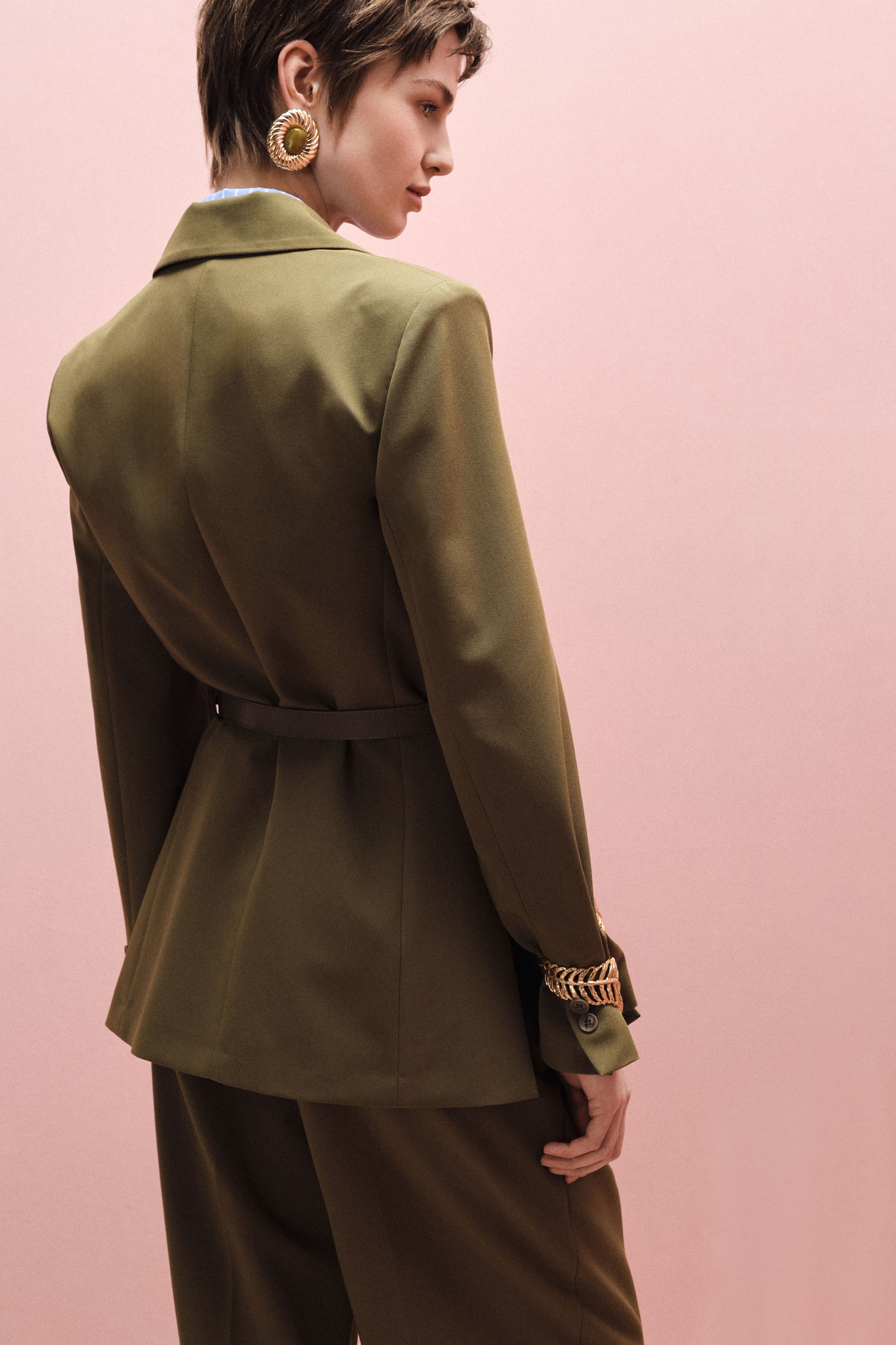 Sako s priliehavou siluetou, doplnené zladeným opaskom na zvýraznenie pásu, jednoradovým zapínaním na gombíky a vreckami s chlopňou. Navrhnuté pre tých, ktorí oceňujú všestrannosť a moderný štýl, ponúka nekonečné možnosti kombinovania pre vytvorenie osobitého mestského šatníka.
