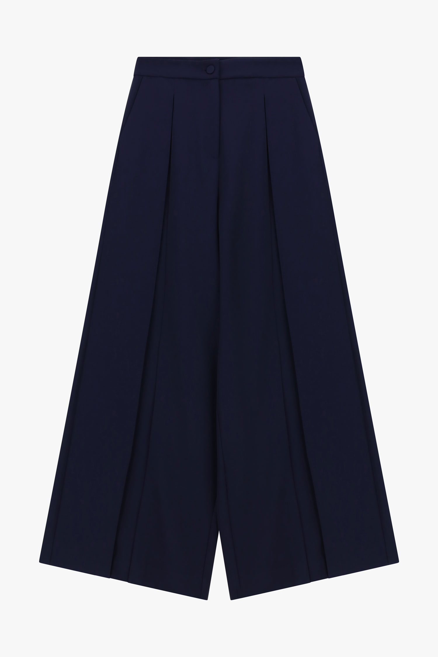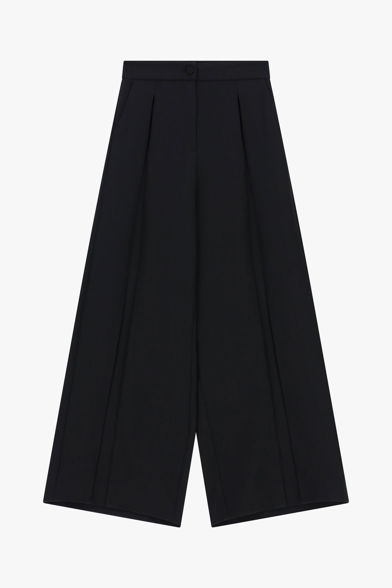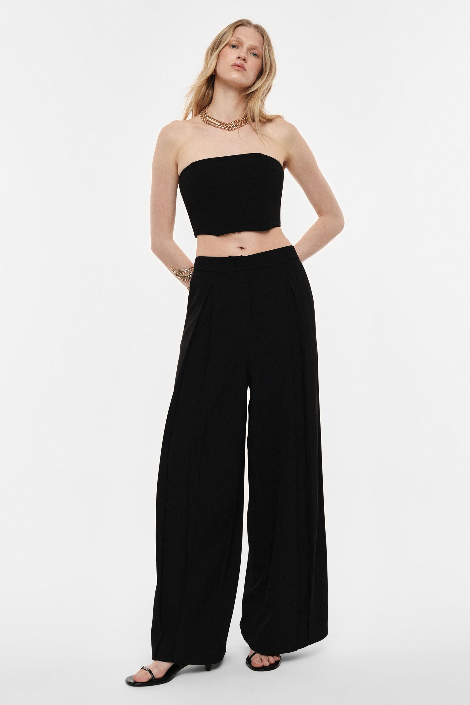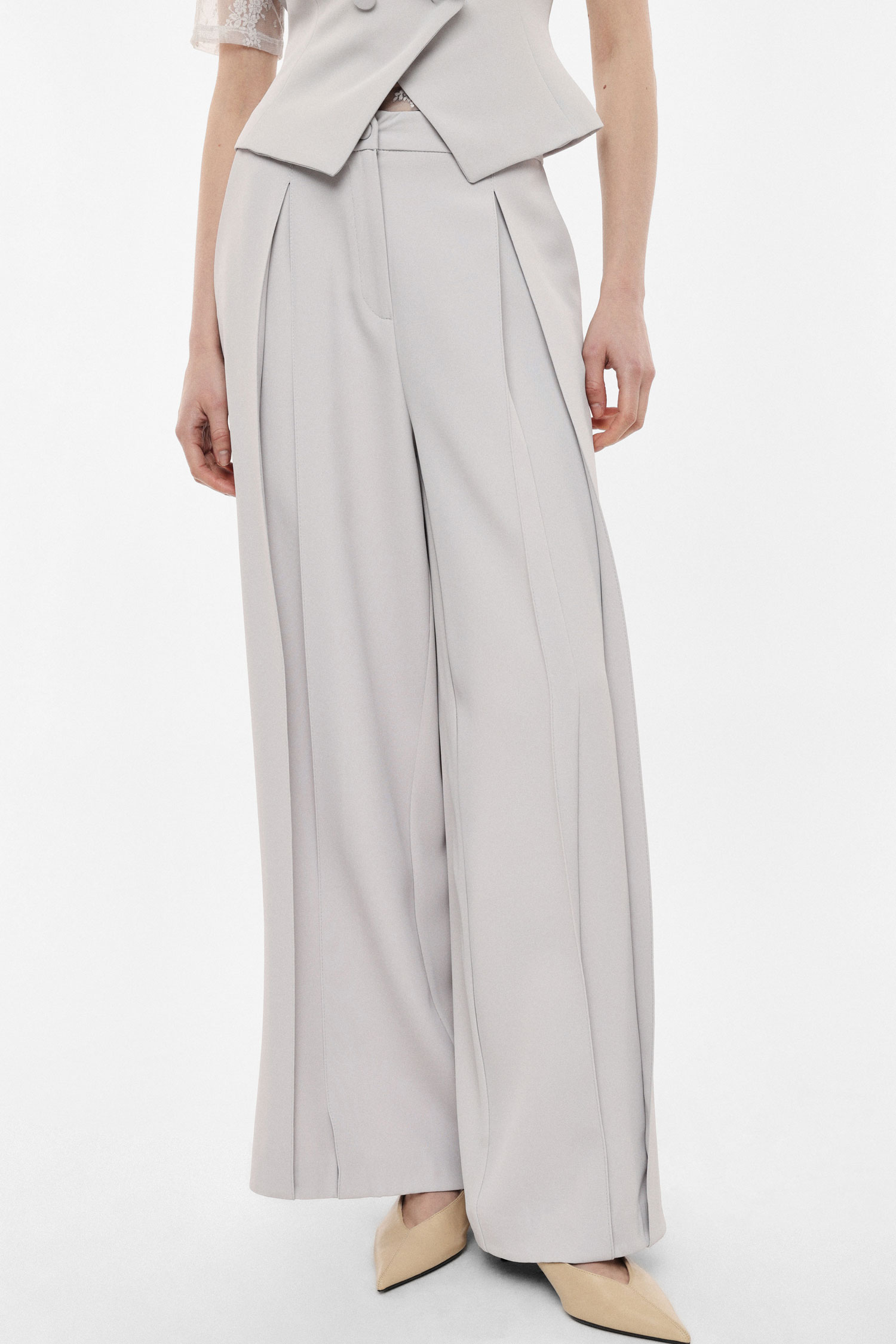Elegantné široké nohavice s vysokým pásom, ktoré vytvárajú splývavú siluetu a opticky predlžujú postavu. Predné záhyby dodávajú modelu sofistikovaný výraz a zároveň zabezpečujú pohodlie pri pohybe. Čisté línie a minimalistický dizajn z nich robia nadčasový kúsok vhodný do mestských aj pracovných outfitov, ľahko kombinovateľný s košeľami, topmi či sakami.