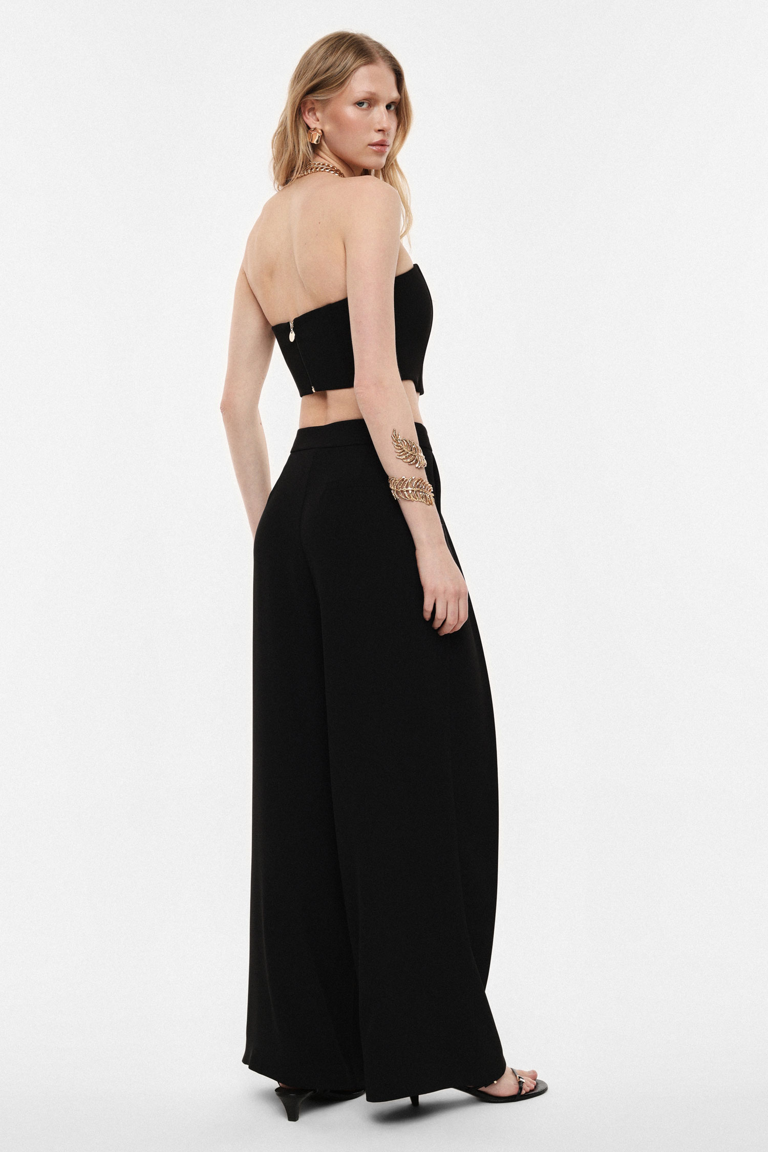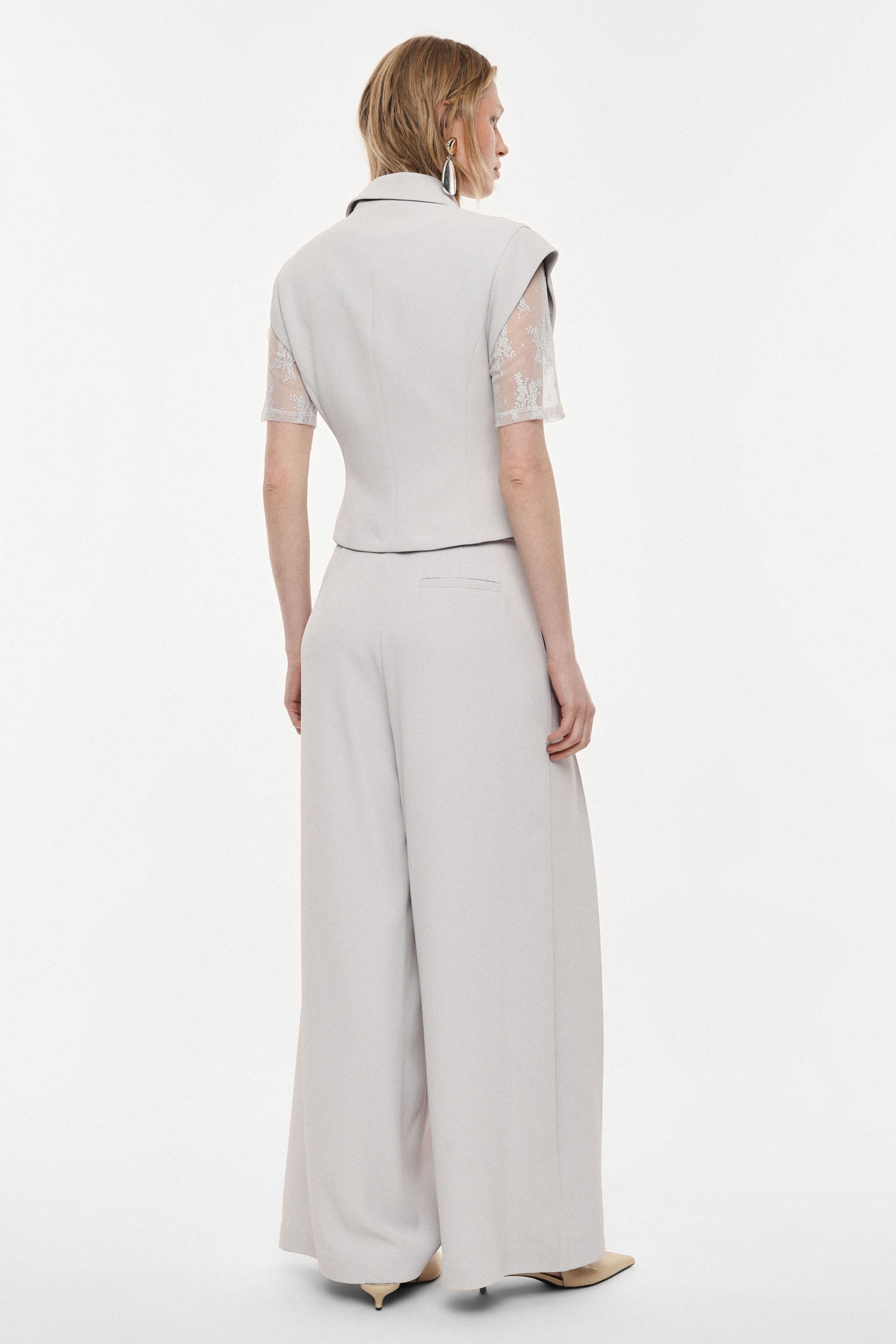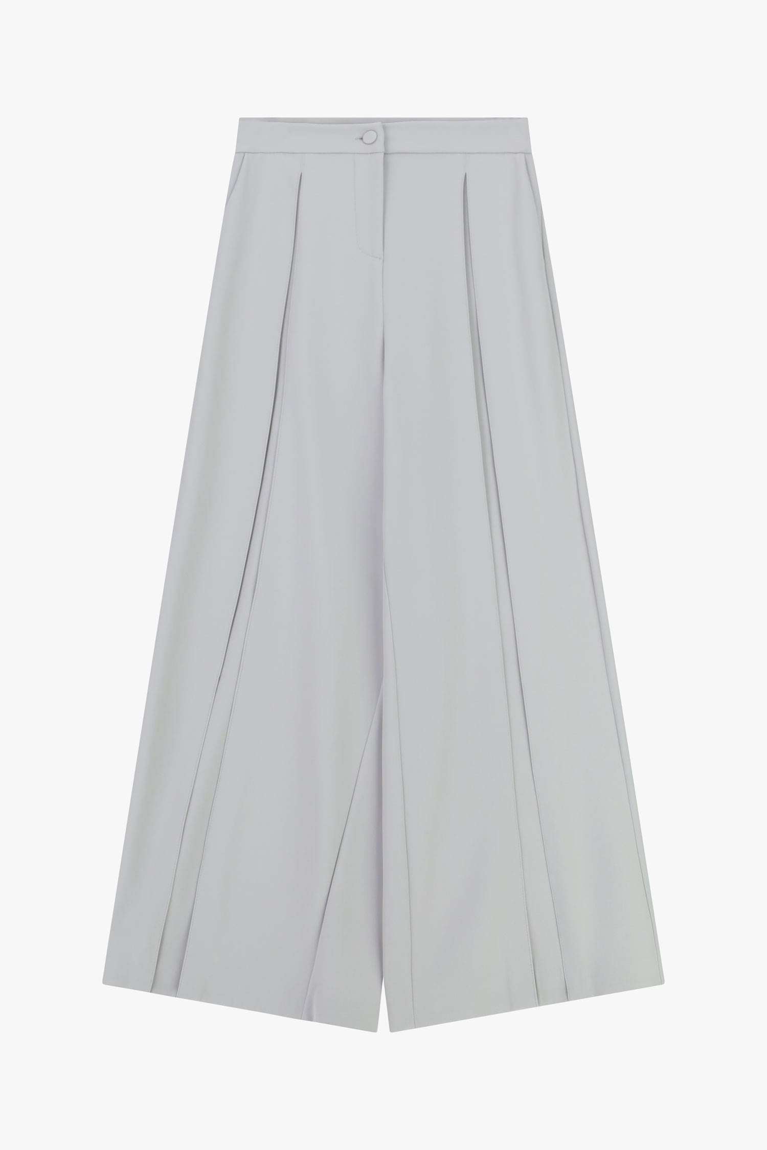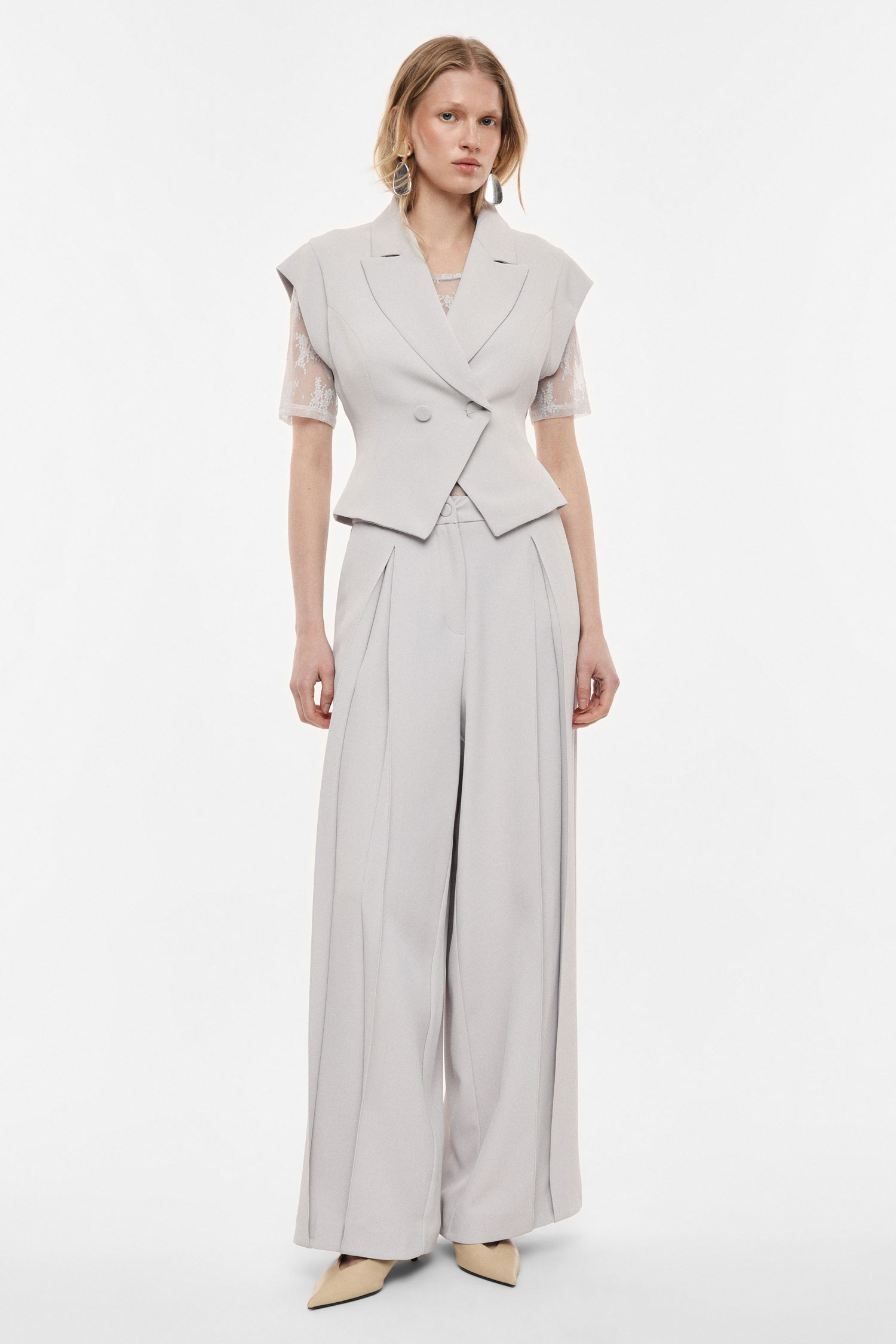 Elegantné široké nohavice s vysokým pásom, ktoré vytvárajú splývavú siluetu a opticky predlžujú postavu. Predné záhyby dodávajú modelu sofistikovaný výraz a zároveň zabezpečujú pohodlie pri pohybe. Čisté línie a minimalistický dizajn z nich robia nadčasový kúsok vhodný do mestských aj pracovných outfitov, ľahko kombinovateľný s košeľami, topmi či sakami.